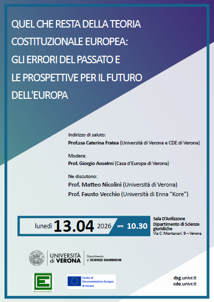Il Dipartimento di Scienze Giuridiche dell’Università di Verona e Casa d’Europa di Verona organizzano un incontro dedicato alla teoria costituzionale europea, in programma lunedì 13 aprile 2026 alle ore 10:30 presso la Sala D’Ardizzone.